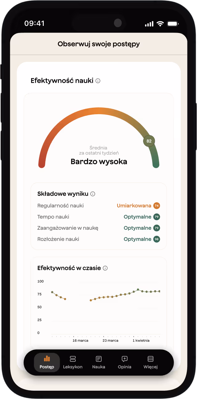 Efektywność nauki to wskaźnik (0–100) pokazujący, jak skutecznie uczysz się słownictwa w ostatnich 7 dniach. Uwzględnia cztery kluczowe elementy: regularność, tempo, zaangażowanie oraz rozłożenie nauki w ciągu dnia. Dzięki temu widzisz nie chwilowe wahania, lecz ogólny trend i jakość całego procesu. Wysoki wynik oznacza, że efektywnie wykorzystujesz czas, a Twoje postępy są dobrze zaplanowane. Jeśli wskaźnik spada, łatwo sprawdzisz, co wymaga poprawy i dostosujesz naukę, by szybciej osiągnąć swoje cele.