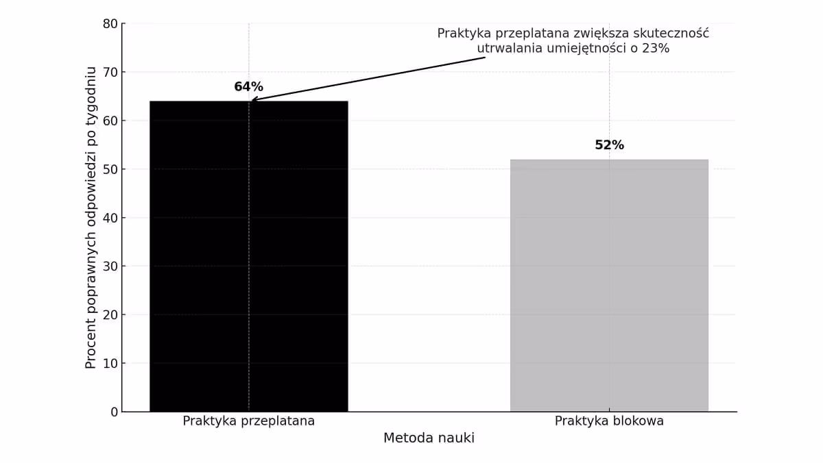 Po tygodniu od nauki grupa stosująca praktykę przeplataną uzyskała 64% poprawnych odpowiedzi, podczas gdy grupa ucząca się blokowo jedynie 52%. Oznacza to, że przeplatanie materiału było o 23% skuteczniejsze w utrwalaniu umiejętności, co przełożyło się na efekt statystyczny d = 0,53, czyli średni do dużego.