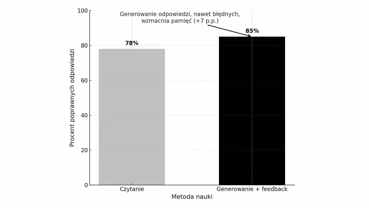 Wyniki pięciu eksperymentów były spójne — pary słów, przy których uczestnicy najpierw zgadywali, były zapamiętywane o 7 do nawet 19 punktów procentowych lepiej niż te, które tylko czytano. Co ciekawe, uczestnicy błędnie oceniali zgadywanie jako mniej skuteczne, podczas gdy faktycznie aktywne generowanie odpowiedzi, nawet błędnych, połączone z natychmiastowym feedbackiem, znacząco wzmacniało pamięć.