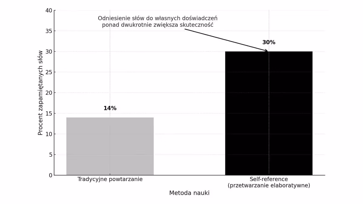 Badanie pokazuje, że odnoszenie nowych słów do własnych doświadczeń – nawet w prostych zdaniach, np. „Wczoraj widziałem…” – ponad dwukrotnie zwiększa skuteczność zapamiętywania. To dowód, że aktywne tworzenie osobistych kontekstów znacząco wzmacnia pamięć i powinno być stałym elementem procesu nauki.