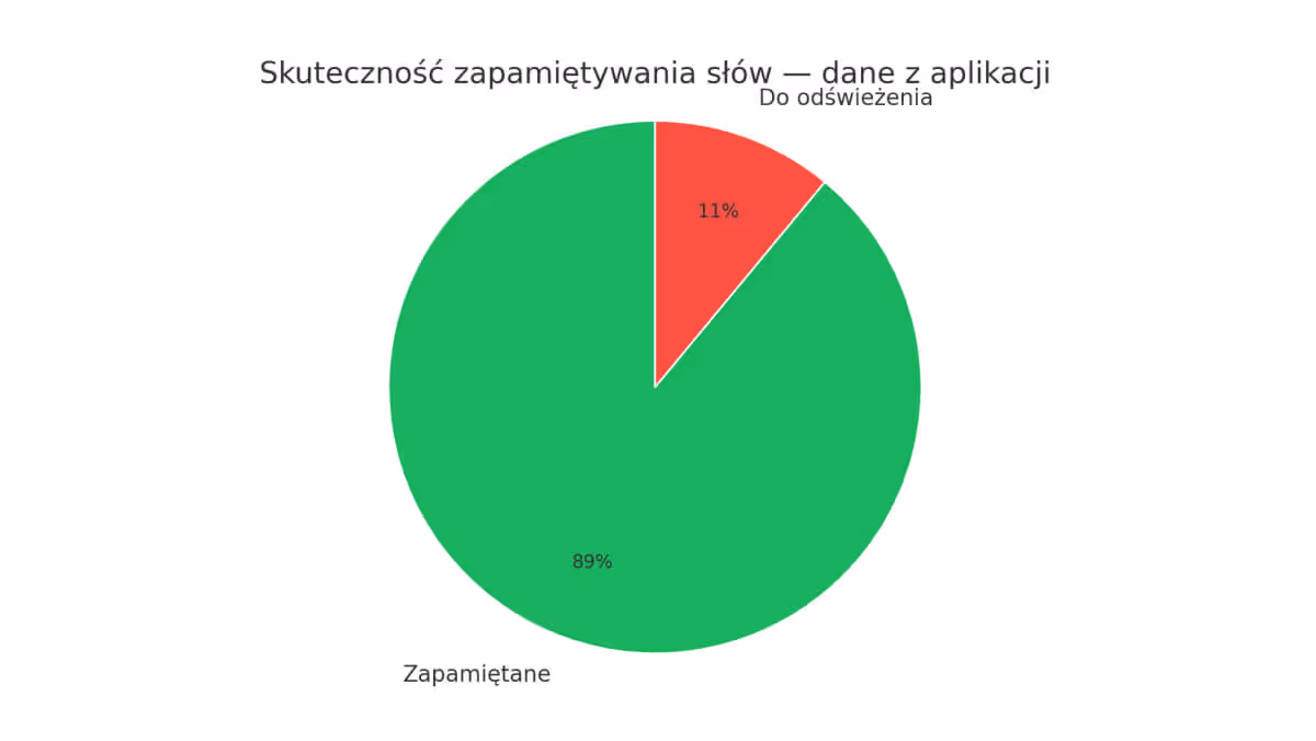 Choć nie dysponujemy jeszcze wynikami niezależnych badań naukowych porównujących naszą metodę z tradycyjnymi, nasze dane z aplikacji pokazują, że użytkownicy osiągają aż 89% skuteczności w zapamiętywaniu słów i utrzymują ten poziom przez długi czas po zakończeniu nauki.